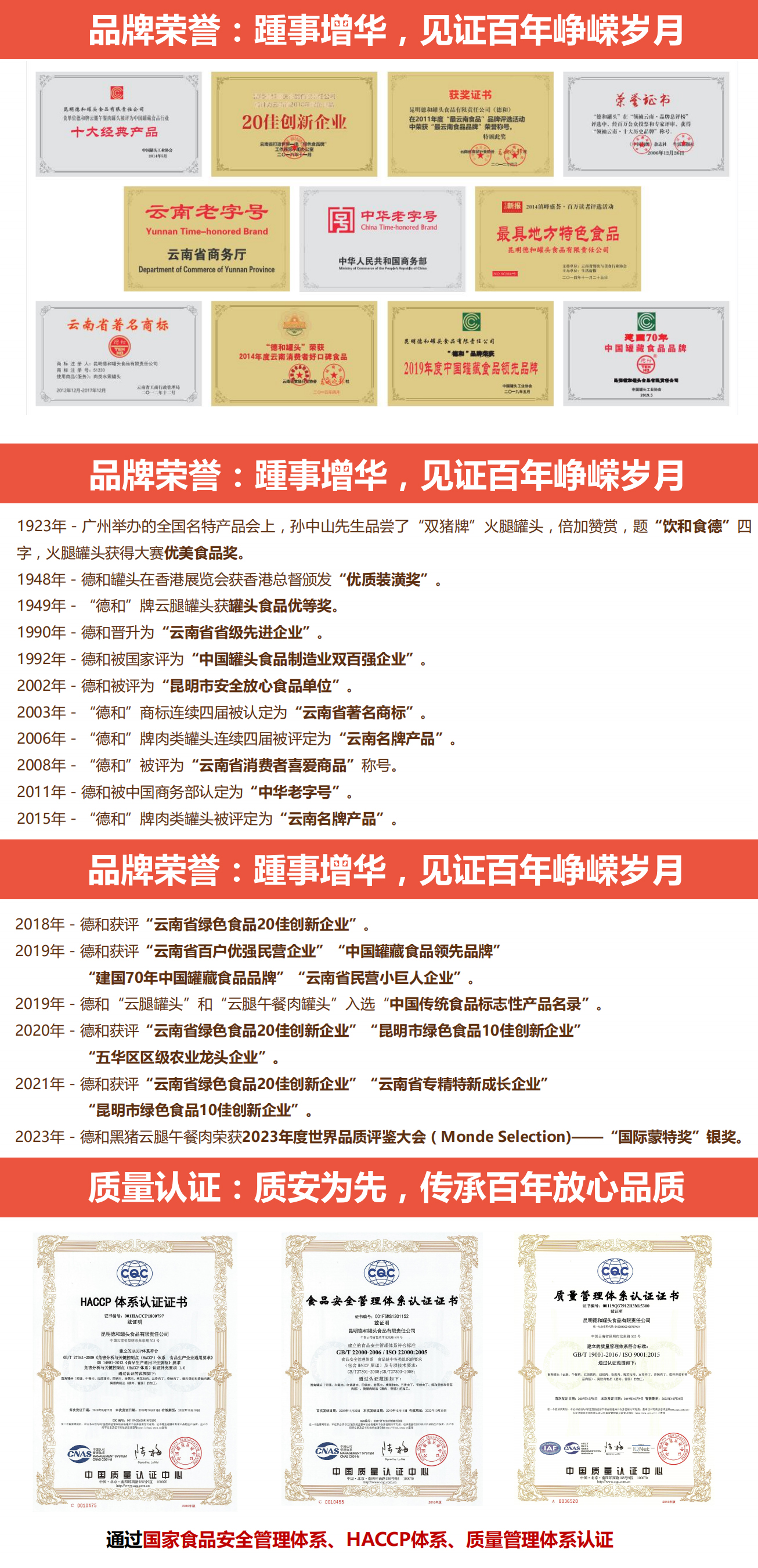 歷經(jīng)百年發(fā)展,德和現(xiàn)已形成集生產(chǎn)、加工、銷(xiāo)售為一體的綜合性食品企業(yè),主營(yíng)云腿午餐肉罐頭、云腿罐頭、生鮮食品、香腸臘肉、調(diào)味醬、家常菜、烘焙糕餅、休閑食品、節(jié)慶食品等近兩百種產(chǎn)品。德和憑借原料好、品質(zhì)優(yōu)、味道佳的產(chǎn)品質(zhì)量,贏得了眾多消費(fèi)者的喜愛(ài)和信賴(lài),是云南家喻戶(hù)曉的知名品牌。